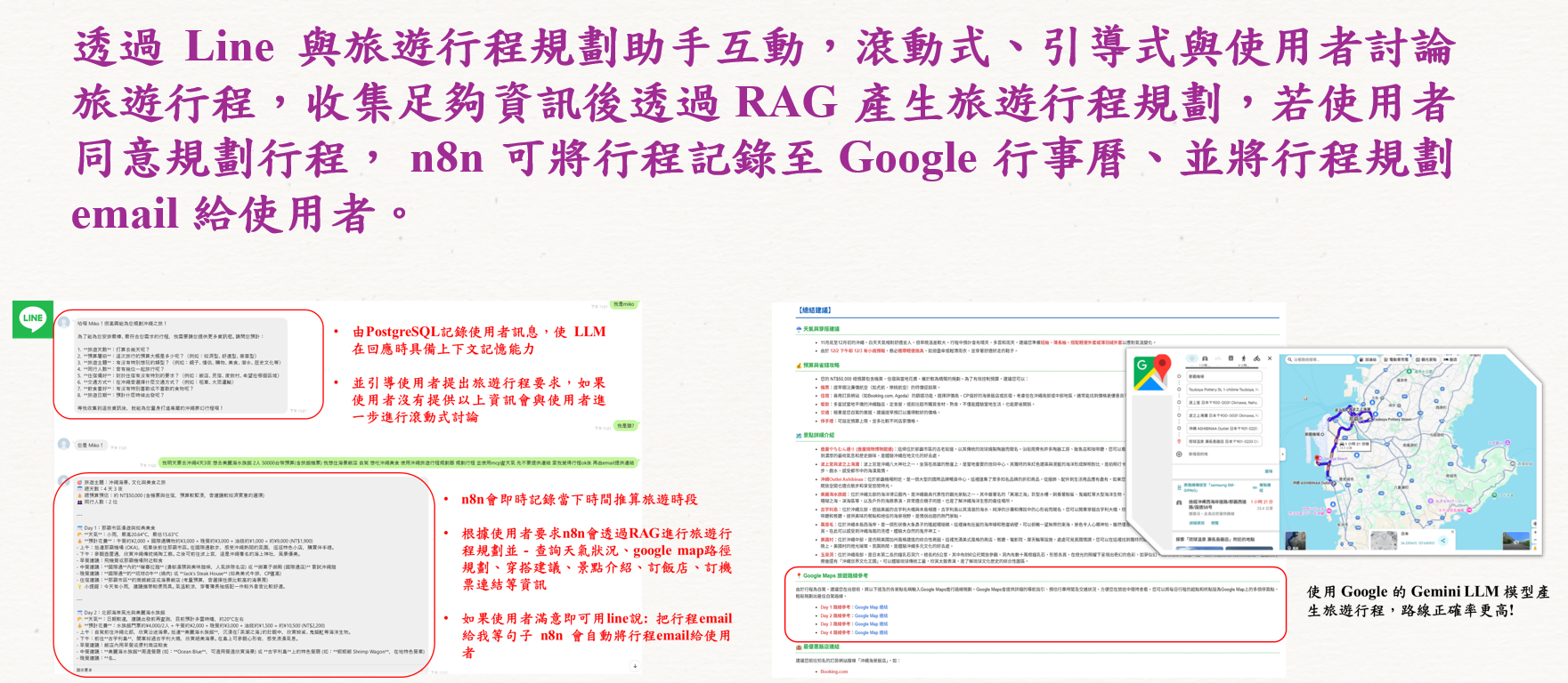 RAG 行程規劃系統: 系統檢索專屬沖繩知識庫,產出包含景點細節、訂飯店/訂機票連結及背景故事的專屬計畫。