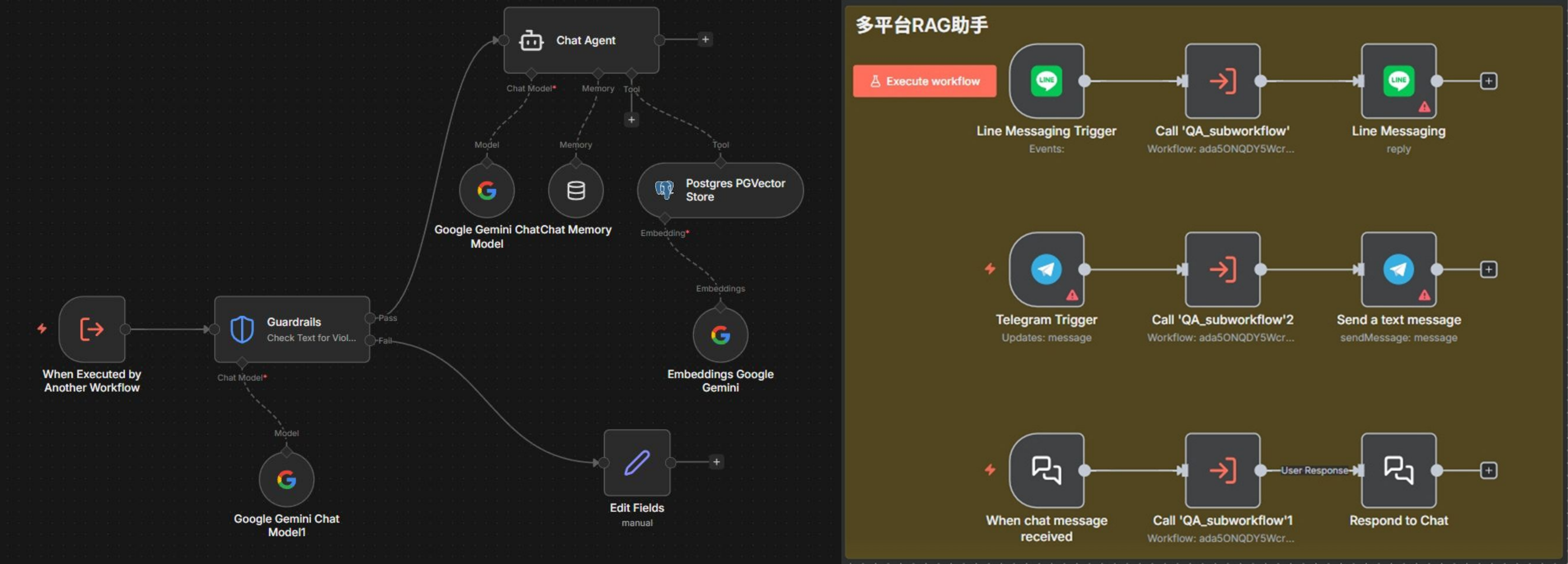 N8n Workflow: 高人性化介面,適合非資訊本科背景人員,快速調整agent提示詞與資料庫,以及串接通訊軟體(如: Line, Telegram)。