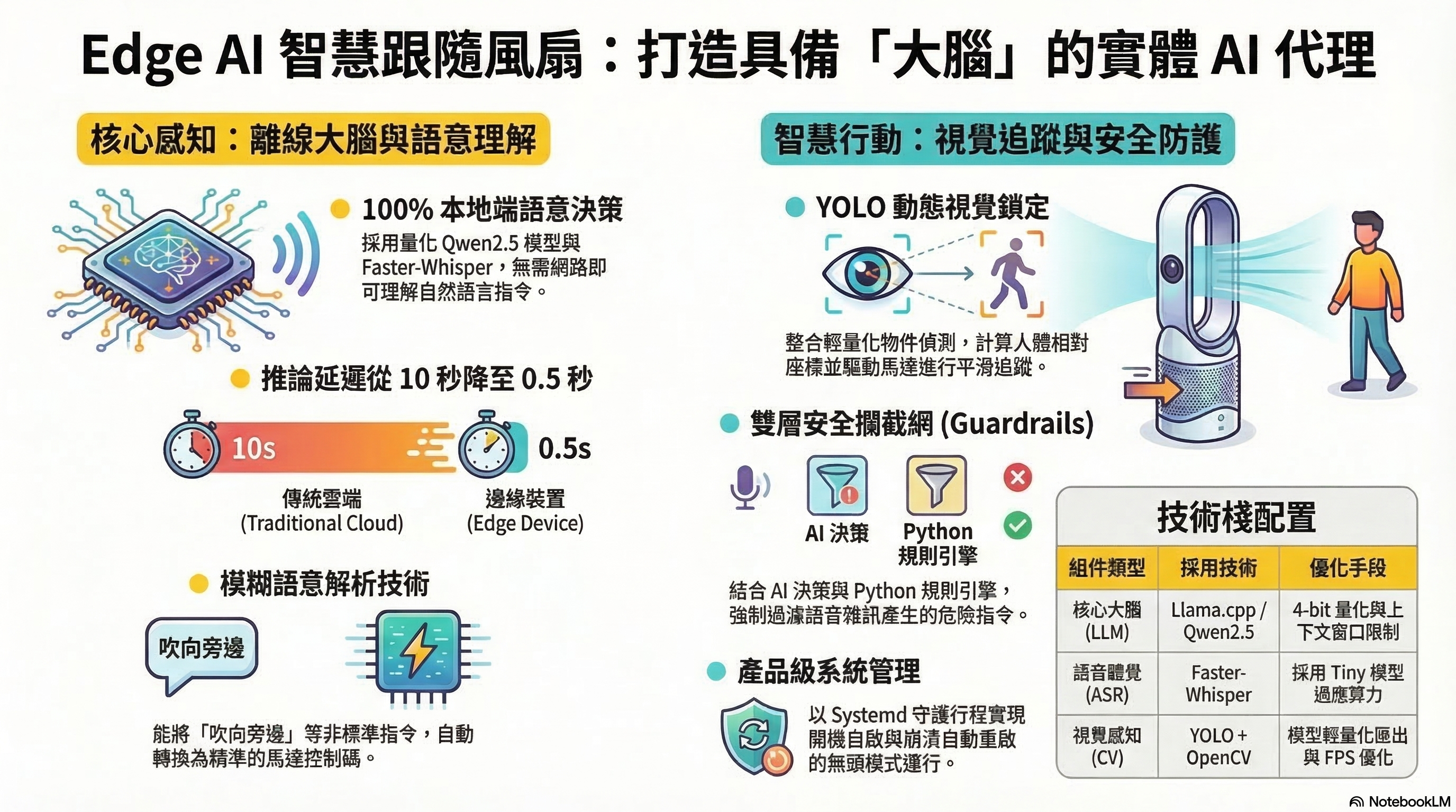 本專案讓離線 Edge LLM應用於智慧家電之可行性提高。系統能在不依賴任何外部網路連線的條件下,實現精準的人體視覺追蹤與流暢的自然語言互動。 透過知識蒸餾 (Teacher-Student) 概念輕量化視覺模型,以及 LLM 提示詞工程的精準調校,系統在有限的 ARM 架構算力下達成了效能與準確率的最佳平衡。